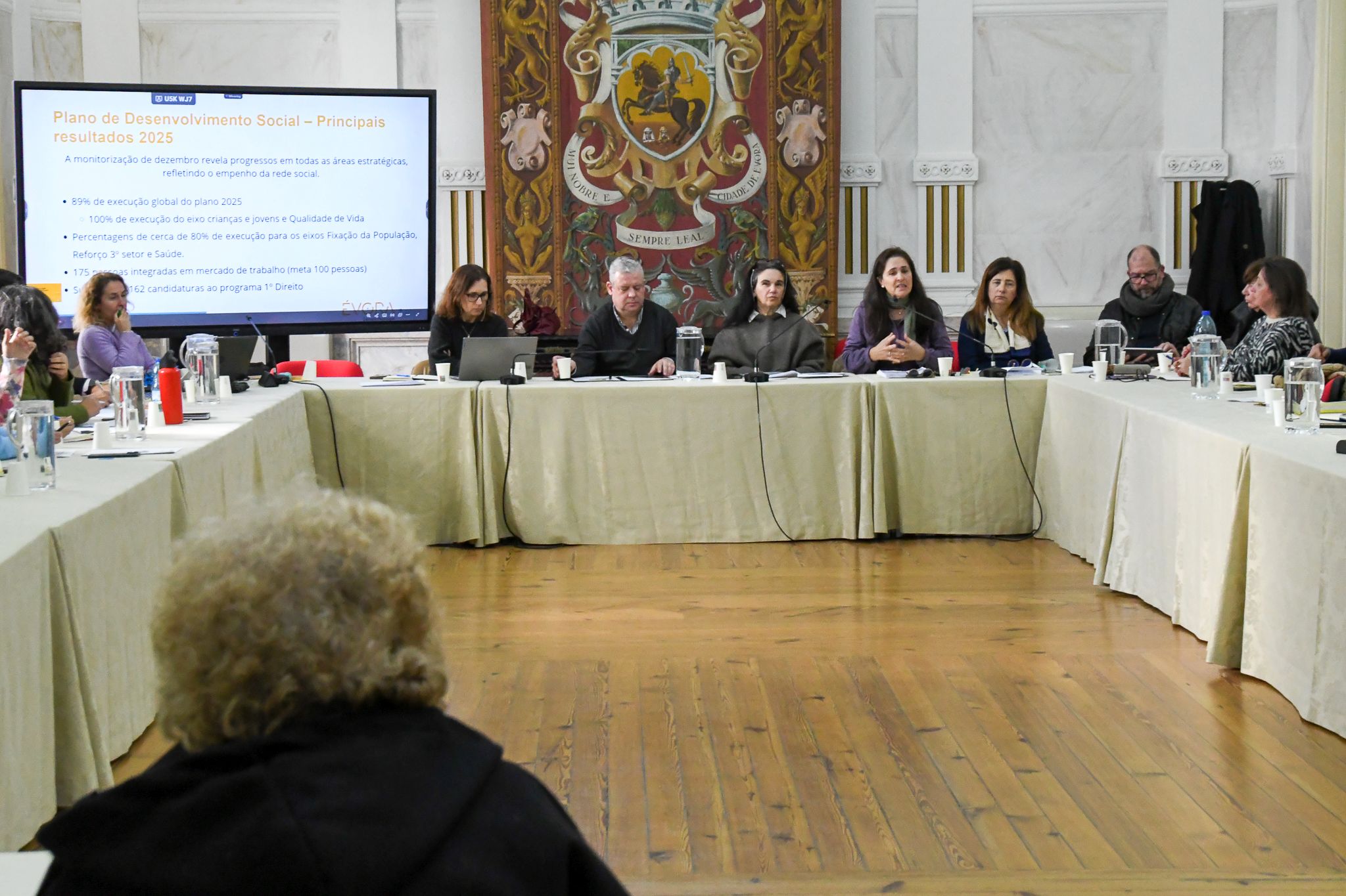 Do trabalho realizado, no que concerne ao Plano de Desenvolvimento Social, salienta-se a execução global de 89% do Plano em 2025, com percentagens de 100% de execução do eixo Crianças e Jovens e Qualidade de Vida e de 80% nos eixos de Fixação da População, Reforço do 3º Setor e Saúde. De sublinhar ainda a integração de 175 pessoas no mercado de trabalho (meta 100 pessoas), 162 candidaturas ao programa 1º Direito, elaboração do Diagnóstico de Pobreza Infantil do Concelho de Évora e Plano de Ação do Núcleo de Garantia para a Infância de Évora, dinamização do projeto Vivamente (de cuidados destinados a pessoas com défice cognitivo ligeiro e demência em estádio inicial a moderado, bem como aos seus cuidadores e familiares), apoio financeiro a associações da área social e finalização do Plano Municipal para a Integração de Migrantes.