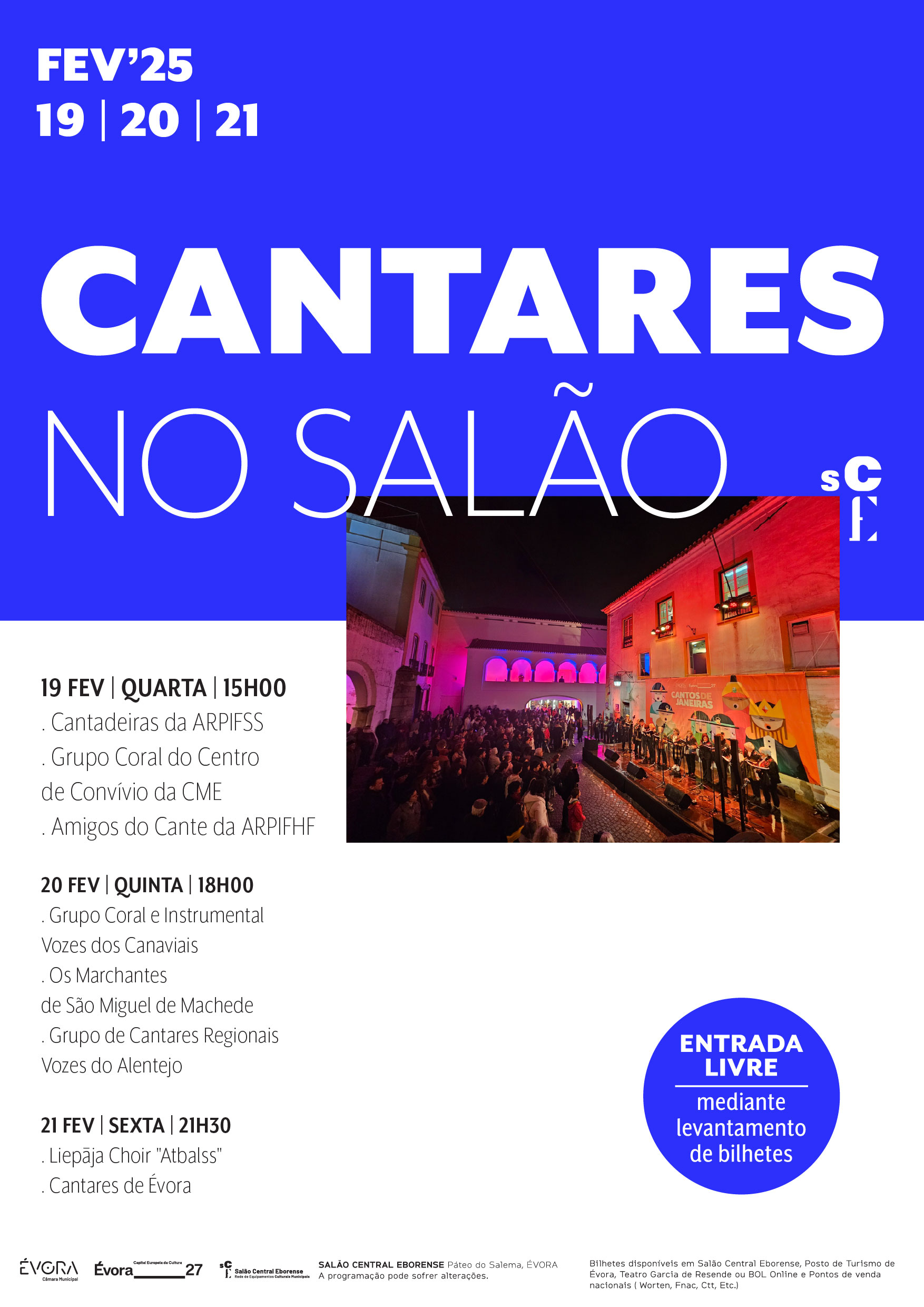 No dia 19, quarta-feira, os Cantares no Salão arrancam às 15h00 com as Cantadeiras da ARPIFSS, o Grupo Coral do Centro de Convívio da Câmara Municipal de Évora e o grupo de Amigos do Cante da ARPIFHF. Para quinta-feira, dia 20, às 18h00, estão programadas as atuações do Grupo Coral e Instrumental Vozes dos Canaviais, Os Marchantes de São Miguel de Machede e do Grupo de Cantares Regionais Vozes do Alentejo. Finalmente, na sexta-feira, dia 21, a partir das 21h30, atuam o Liepāja Choir Atbalss (Letónia), cabendo o encerramento ao Grupo de Cantares de Évora.
