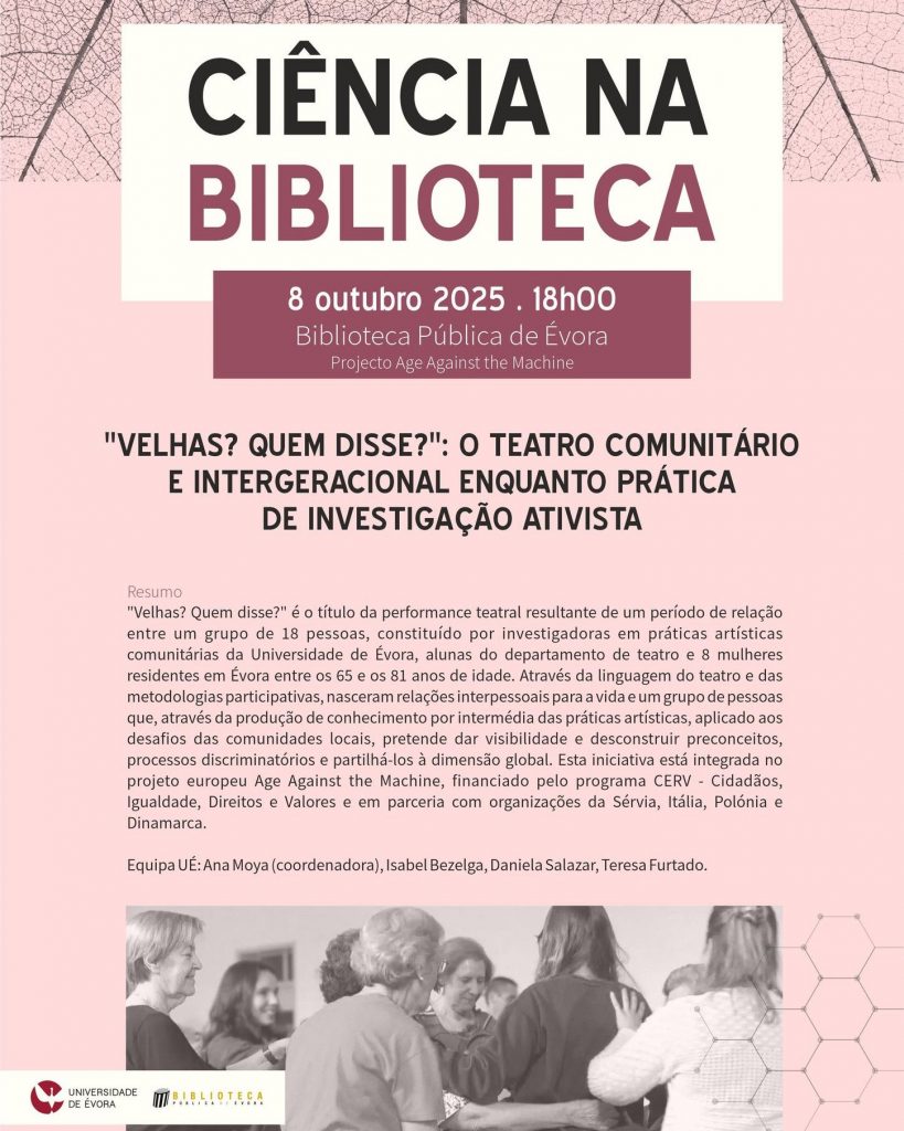 Para iniciar este ciclo, no dia 8 de outubro, vamos ficar a saber mais sobre o projeto Age Against the Machine e conhecer a iniciativa “Velhas? Quem disse?”: o teatro comunitário e intergeracional enquanto prática de investigação ativista.