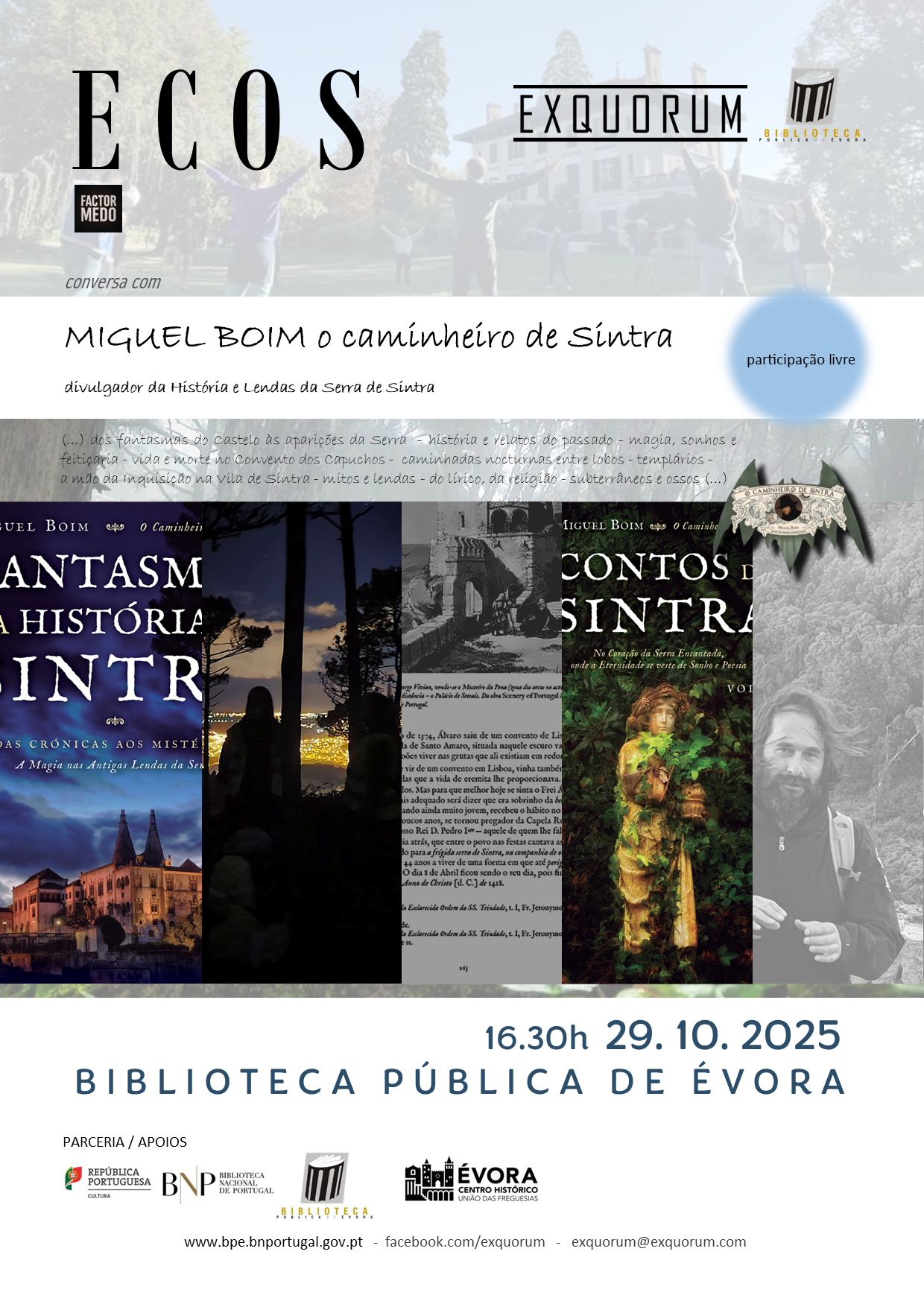 Integrado no programa ECOS, a ExQuorum convida Miguel Boim “O caminheiro de Sintra”, divulgador da História e Lendas da Serra de Sintra, para nos explicar o mundo maravilhoso, rico e misterioso de Sintra, com os seus medos e segredos. É autor de “Sintra Lendária” e “Contos de Sintra”, o blogue e a revista digital “o caminheiro de sintra”, promovendo, ainda, as caminhadas noturnas em Sintra, entre muitas outras coisas.