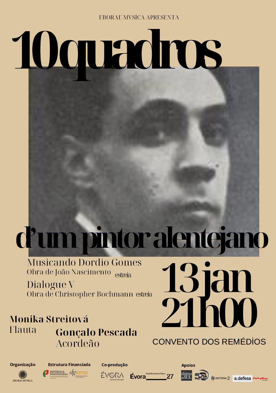 A Eborae Musica – Associação Musical de Évora informa que no dia 13 de janeiro de 2026, pelas 21h00, no Convento dos Remédios, em Évora, será possível assistir à estreia da obra do compositor João Nascimento, intitulada “Dez quadros d’um pintor alentejano | Musicando Dordio Gomes”. Esta peça terá como interpretes Monika Streitová (Flauta) e Gonçalo Pescada (Acordeão).