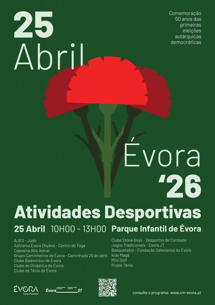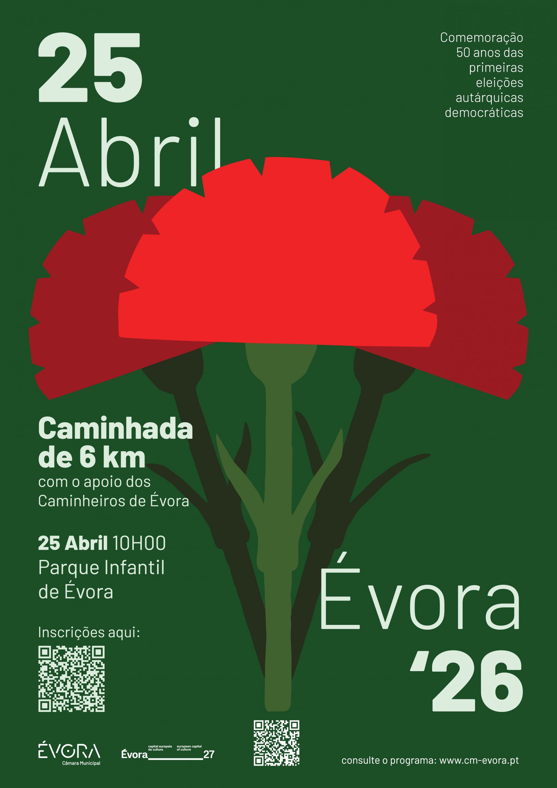Todos os anos, o Município de Évora promove um conjunto de iniciativas destinadas a assinalar e celebrar o dia 25 de abril, data de elevado significado histórico para Portugal. Estas comemorações visam homenagear os valores da liberdade, da democracia e da cidadania, envolvendo a comunidade em momentos de reflexão, cultura e convívio.
