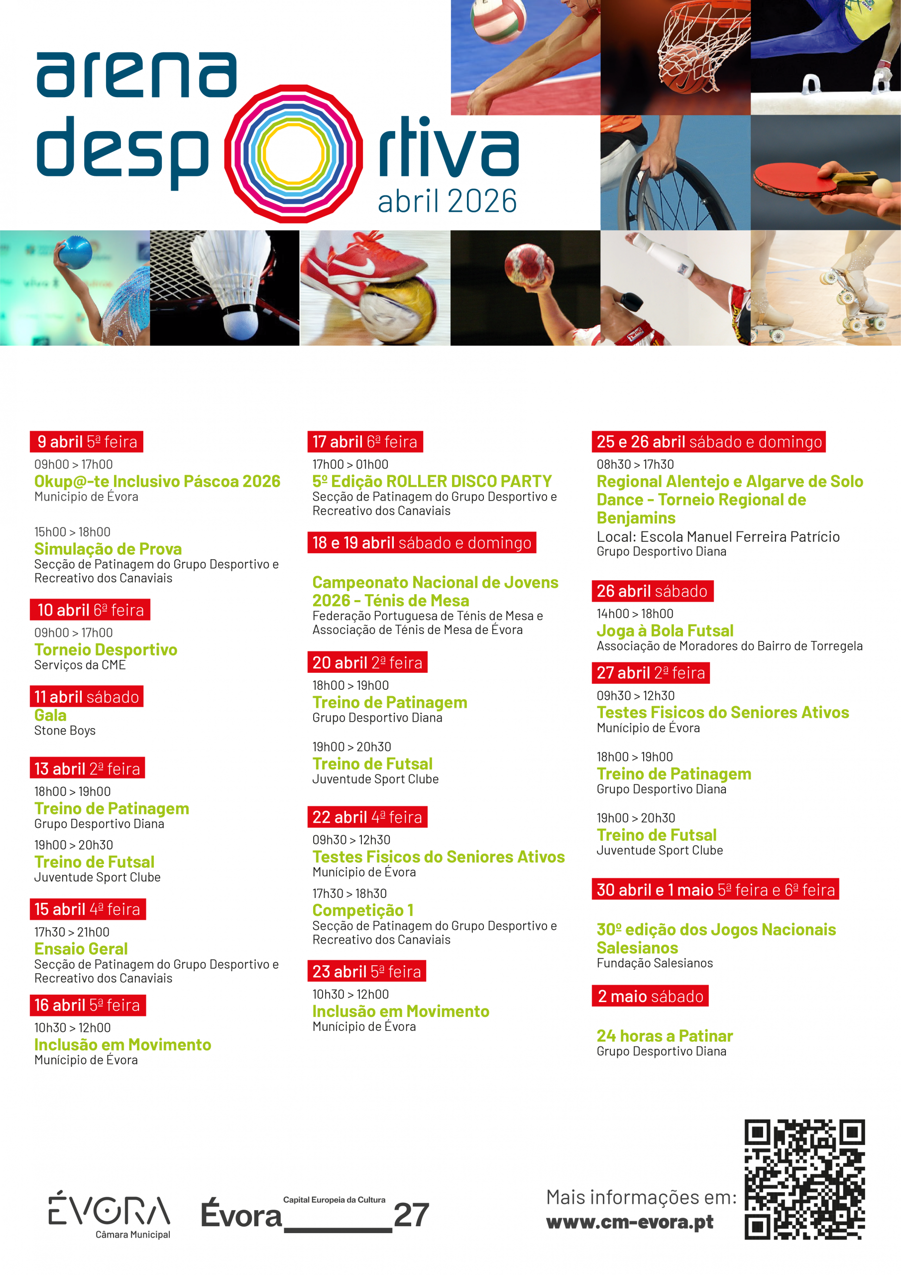 Ao longo de várias semanas, a Arena d’Évora transforma-se num verdadeiro palco desportivo, com treinos, demonstrações e competições em diversas modalidades, desde patinagem artística e futsal a atividades dirigidas à população sénior. O programa inclui ainda momentos de grande participação coletiva, reforçando o espírito de equipa, a inclusão e a promoção de estilos de vida saudáveis.