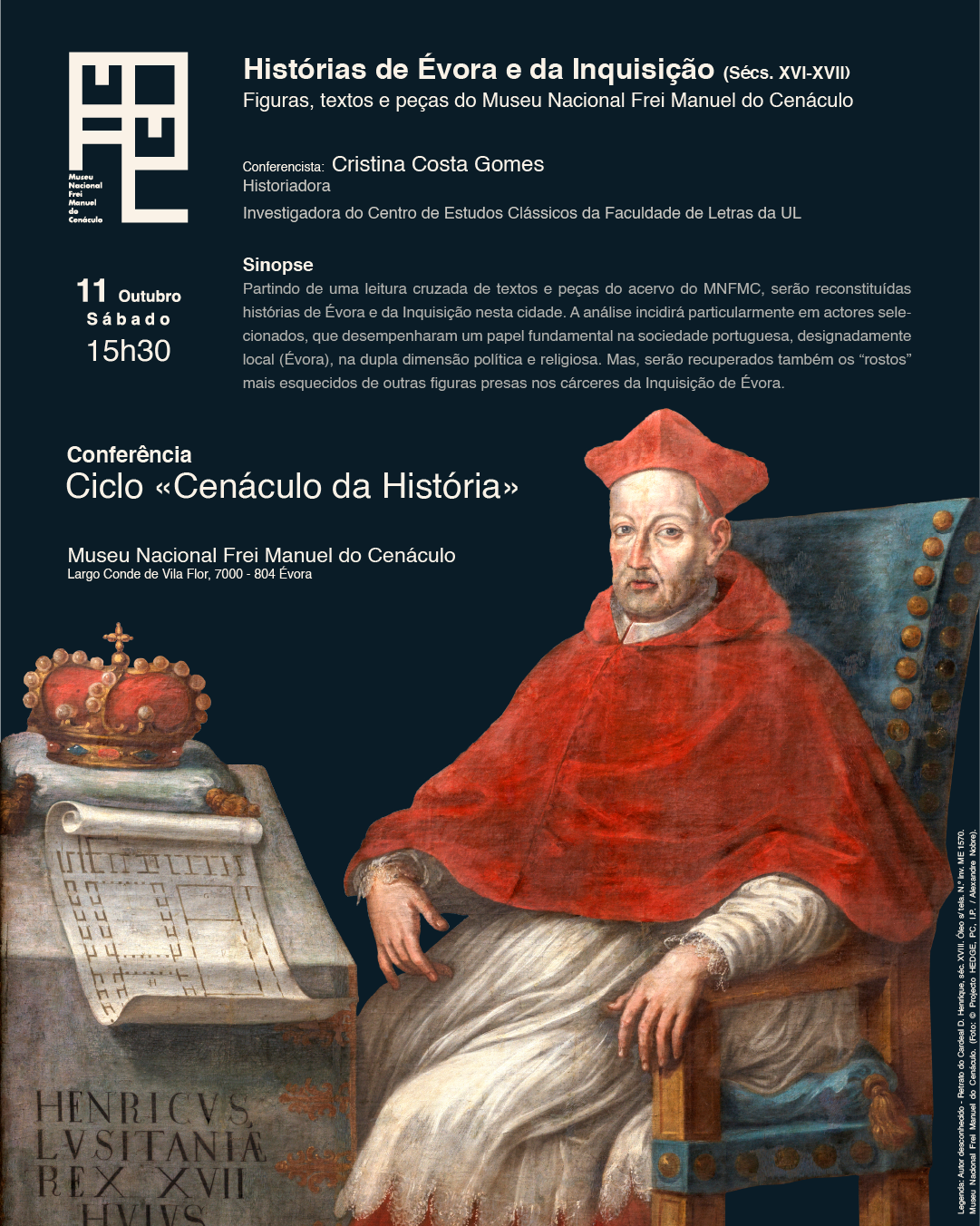 Partindo de uma leitura cruzada de textos e peças do acervo do Museu Nacional Frei Manuel do Cenáculo, serão reconstituídas histórias de Évora e da Inquisição nesta cidade. A análise incidirá particularmente em actores selecionados, que desempenharam um papel fundamental na sociedade portuguesa, designadamente local (Évora), na dupla dimensão política e religiosa. Mas, serão recuperados também os “rostos” mais esquecidos de outras figuras presas nos cárceres da Inquisição de Évora.