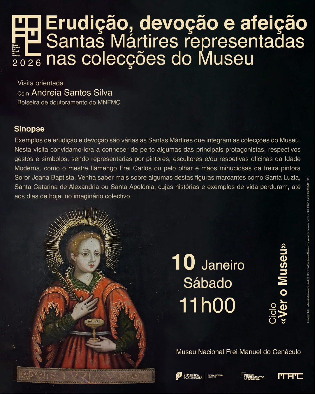 Exemplos de erudição e devoção são várias as Santas Mártires que integram as colecções do Museu. Nesta visita convidamo-lo/a a conhecer de perto algumas das principais protagonistas, respectivos gestos e símbolos, sendo representadas por pintores, escultores e/ou respetivas oficinas da Idade Moderna, como o mestre flamengo Frei Carlos ou pelo olhar e mãos minuciosas da freira pintora Soror Joana Baptista. Venha saber mais sobre algumas destas figuras marcantes como Santa Luzia, Santa Catarina de Alexandria ou Santa Apolónia, cujas histórias e exemplos de vida perduram, até aos dias de hoje, no imaginário colectivo.