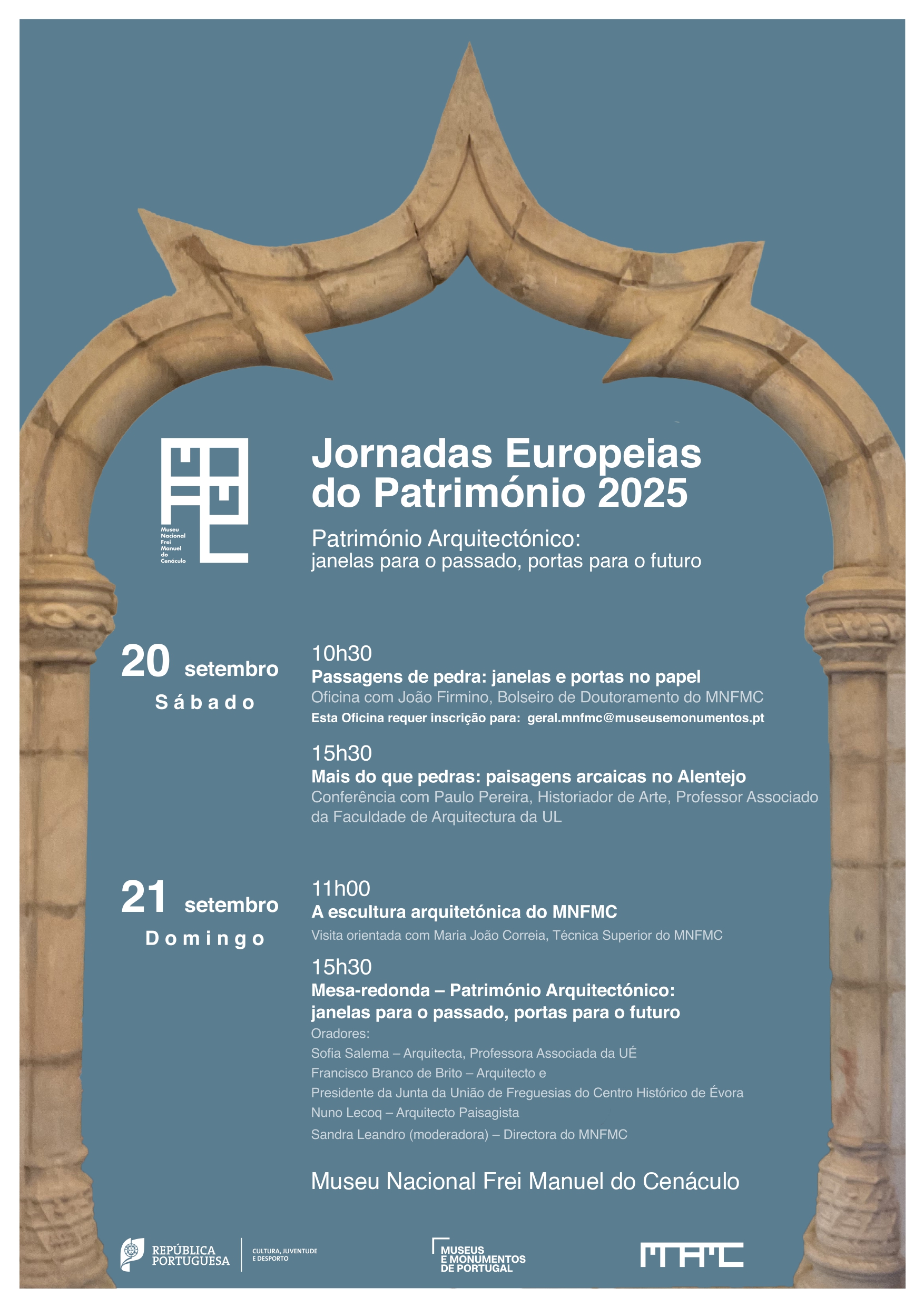 O programa das Jornadas Europeias do Património no Museu Nacional Frei Manuel do Cenáculo, nos dias 20 e 21 de Setembro, proporcionará uma oficina onde se desenhará à vista, uma conferência onde ficaremos a saber mais sobre o Megalitismo, uma visita-orientada sobre elementos estruturais arquitetônicos que se expõe no Museu e uma mesa-redonda sobre «Património Arquitetônico: janelas para o passado, portas para o futuro».