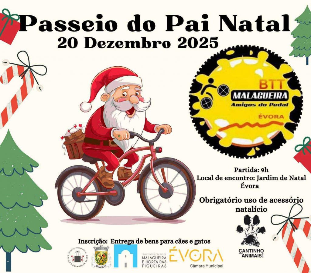 Passeio do Pai Natal  | Evento para toda a família . Concentração no Jardim Público de Évora, com inicio do passeio pelas 9 horas. A voltar vai percorrer o Centro Histórico de Évora , as freguesias Malagueira e Horta das figueiras , Bacelo e Senhor Saúde e Canaviais. Todos os participantes estão “obrigados” a usar adereços alusivos a quadra Natalícia.