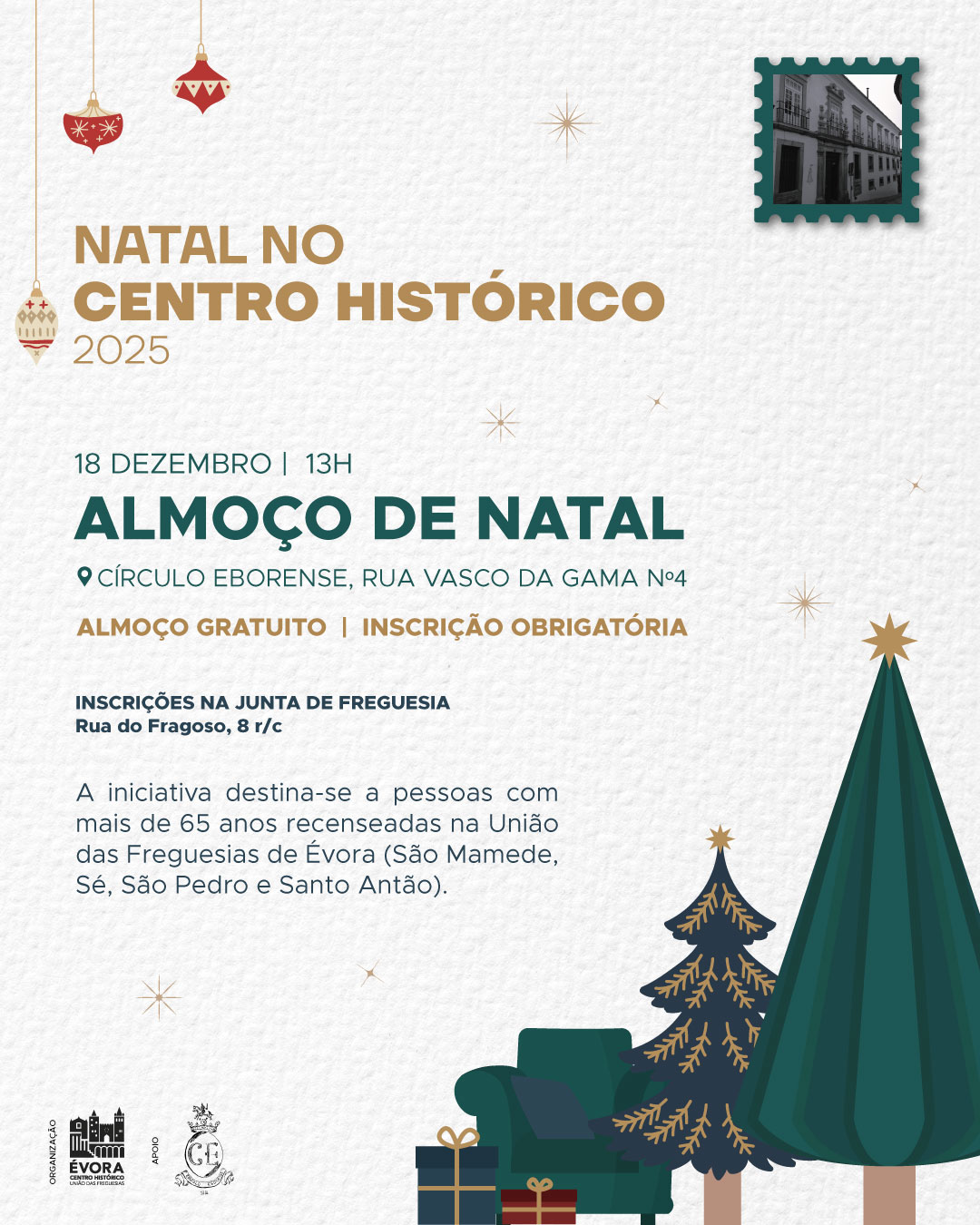 No próximo 𝟭𝟴 𝗱𝗲 𝗱𝗲𝘇𝗲𝗺𝗯𝗿𝗼, às 𝟭𝟯𝗵, convidamos todos os residentes com mais de 65 anos da União das Freguesias de Évora (São Mamede, Sé, São Pedro e Santo Antão) para um Almoço de Natal gratuito, no Círculo Eborense – um momento de convívio, partilha e alegria.