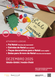 Durante todo o mês de dezembro e até ao Dia de Reis, a Ludoteca terá ao dispor da Famílias visitantes diversas atividades nas áreas do Saber-Fazer e Artes Plásticas, mediadas pelos elementos da equipa, nomeadamente: