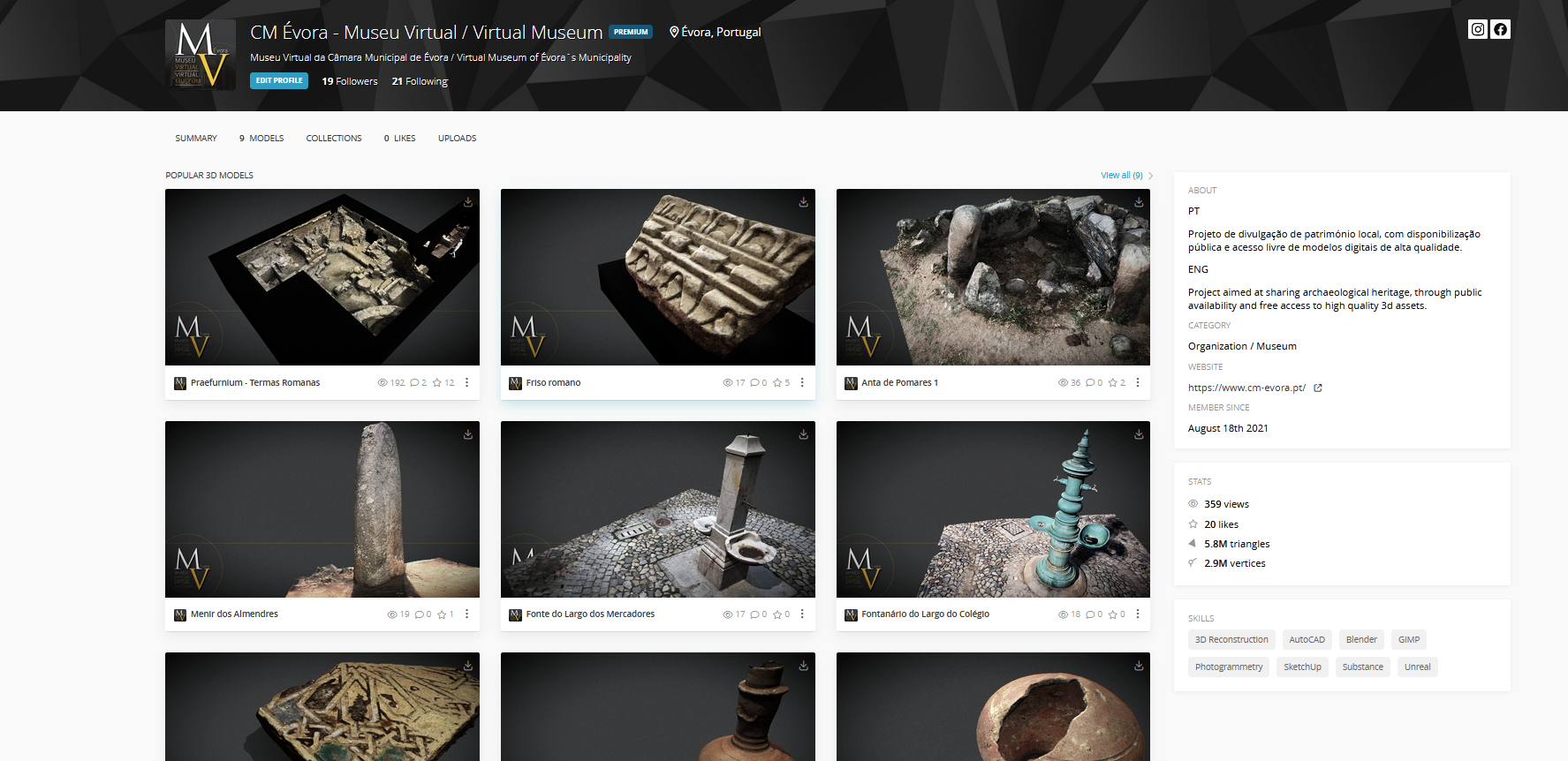 Com o objetivo de divulgação pública de todo o trabalho realizado, foi criado um espaço museológico virtual, com gestão municipal, interligando novas tecnologias com comunicação e educação para o património. Com o estabelecimento de uma colaboração com a plataforma SketchFab, é agora possível aceder a diversos modelos virtuais de várias dimensões patrimoniais eborenses, de forma dinâmica e interativa, estando acessível a partir da ligação disponibilizada acima.